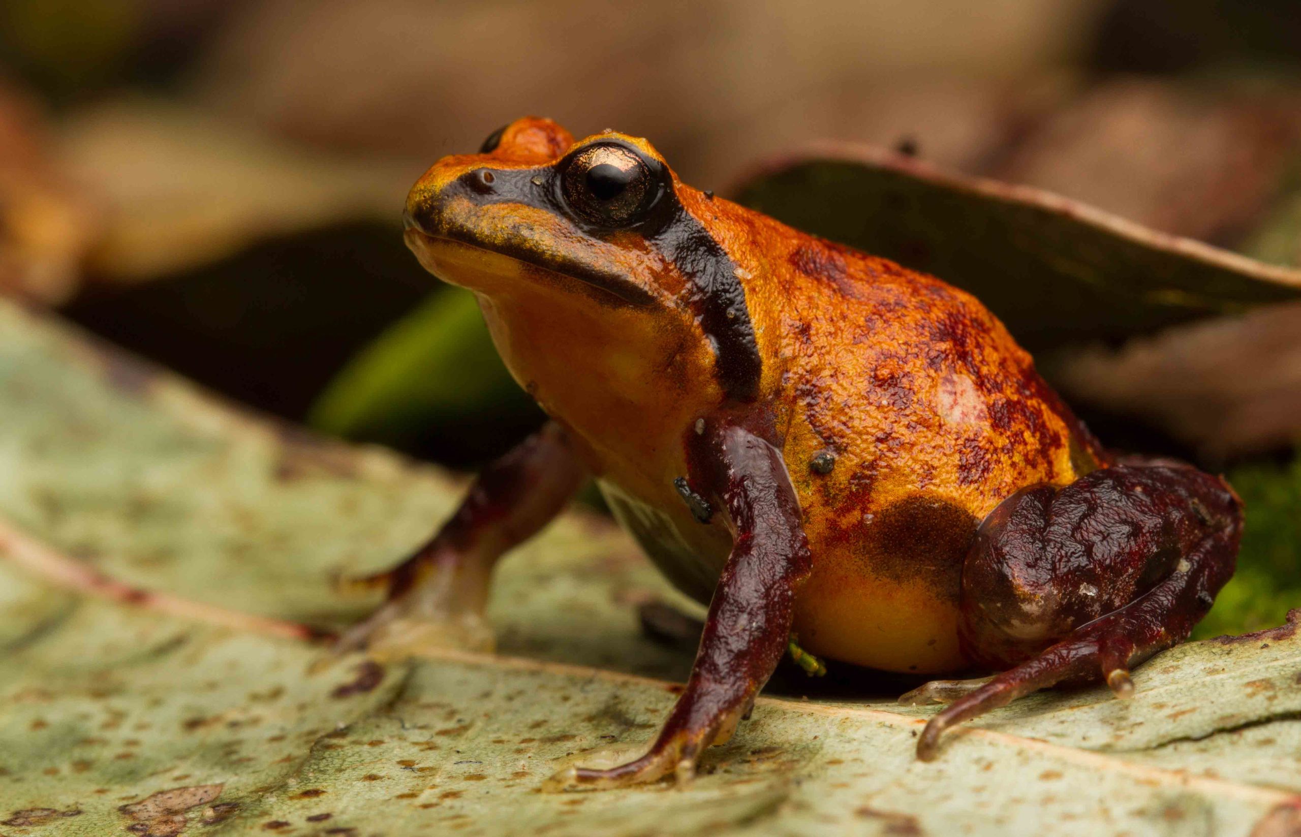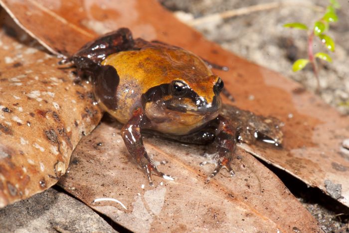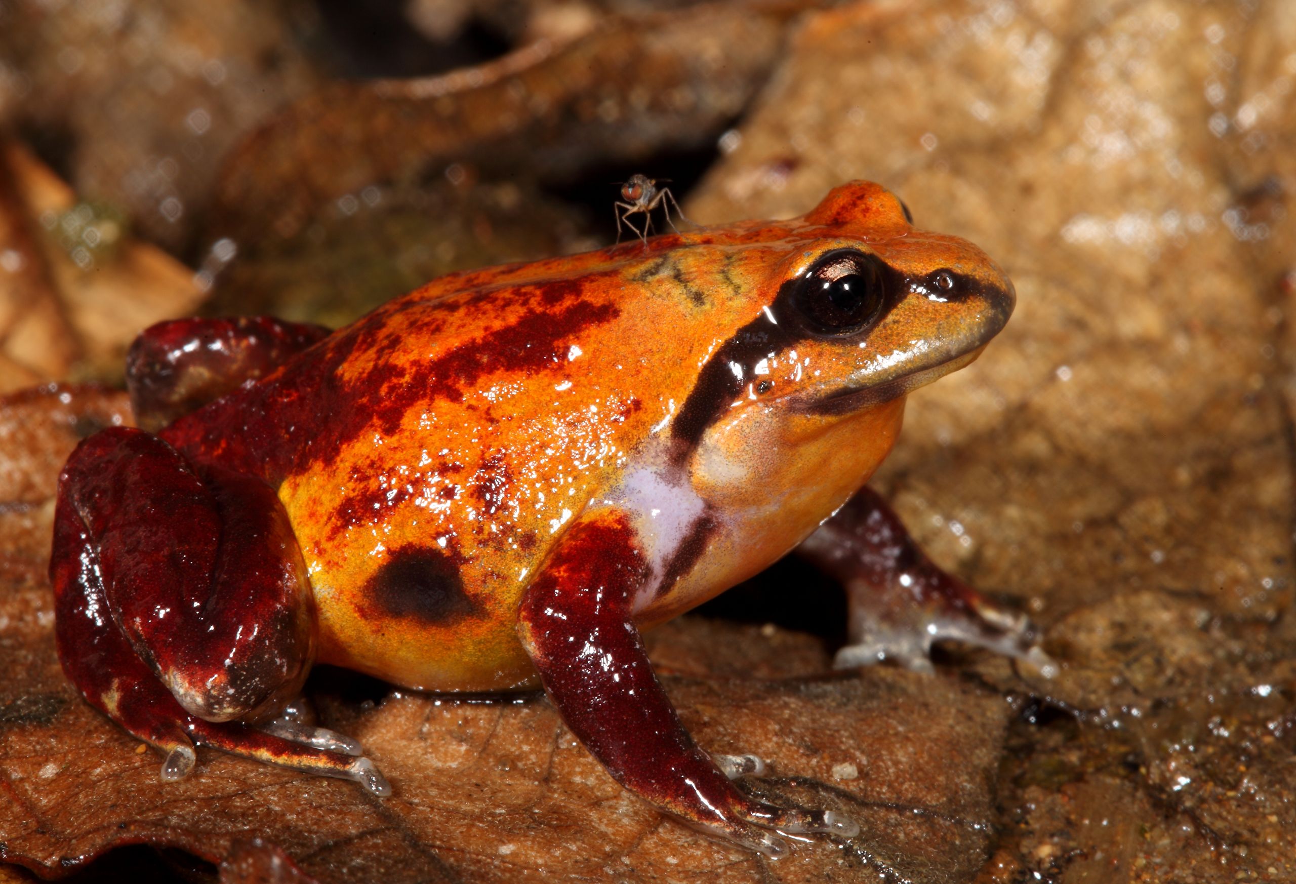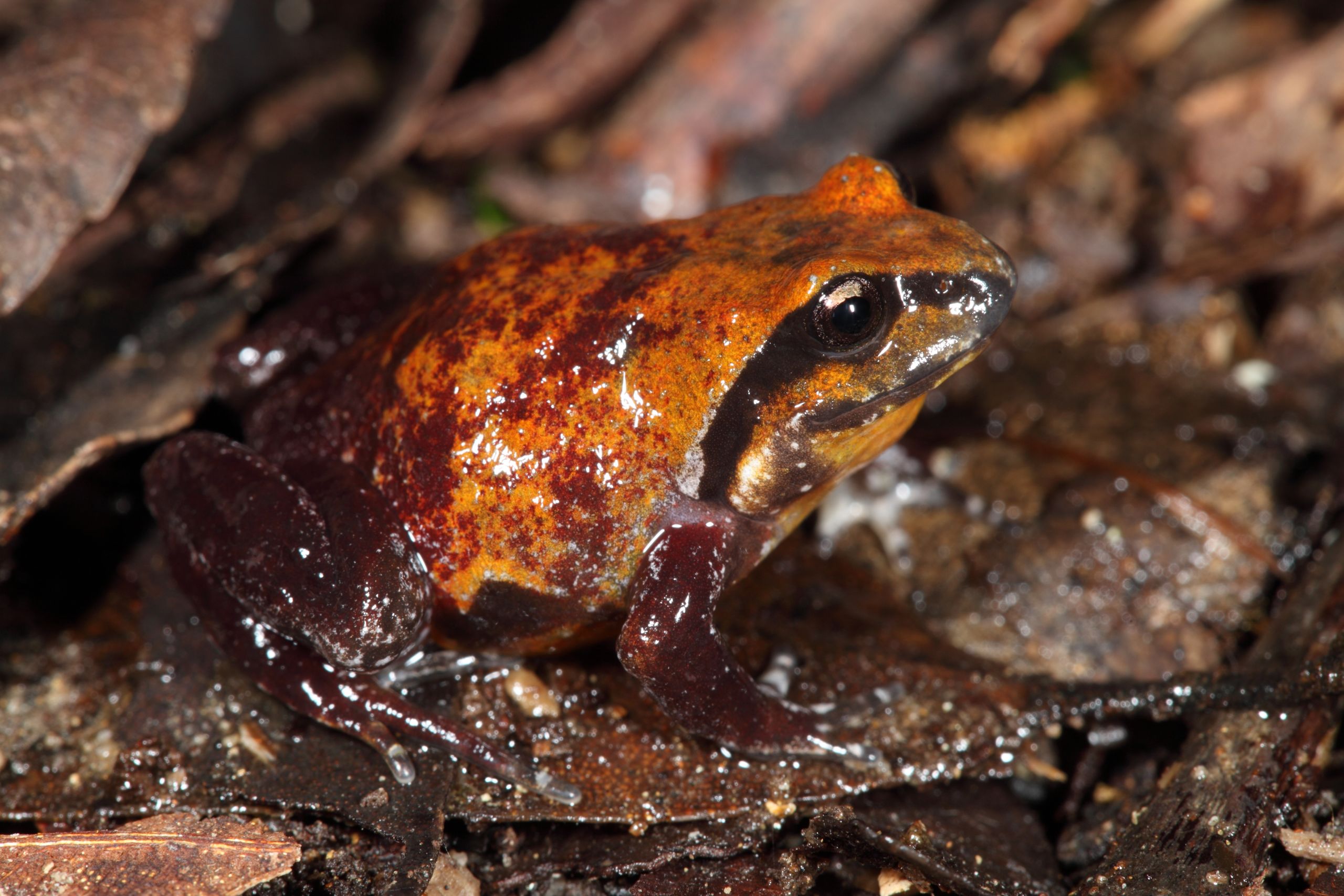 A small species of frog reaching up to 3 cm in body length. It has a yellow-orange or red-purple back, with or without black or red-purple patches on the lower half if the back is yellow-orange. There is a black stripe from the tip of the snout to the arm, and often a black patch on the side. The belly is yellow, with red patches. The pupil is horizontal, and the iris is gold in the upper half and brown in the lower half. The arms and legs are often red-purple if the back is yellow-orange. Fingers and toes are unwebbed, both without discs. The female has large flanges on the first and second finger, which help to whip up protective foam around the eggs as they are laid.